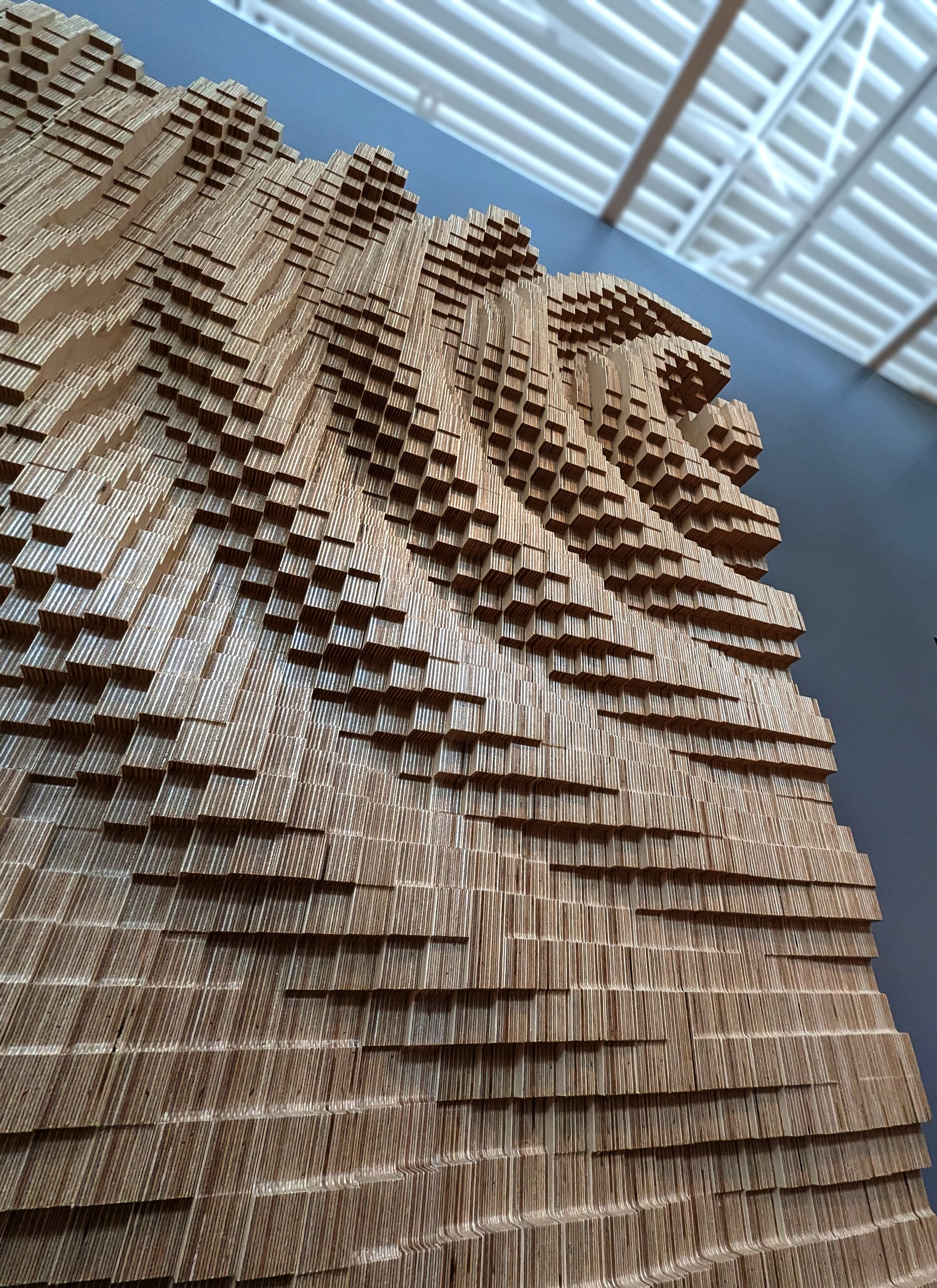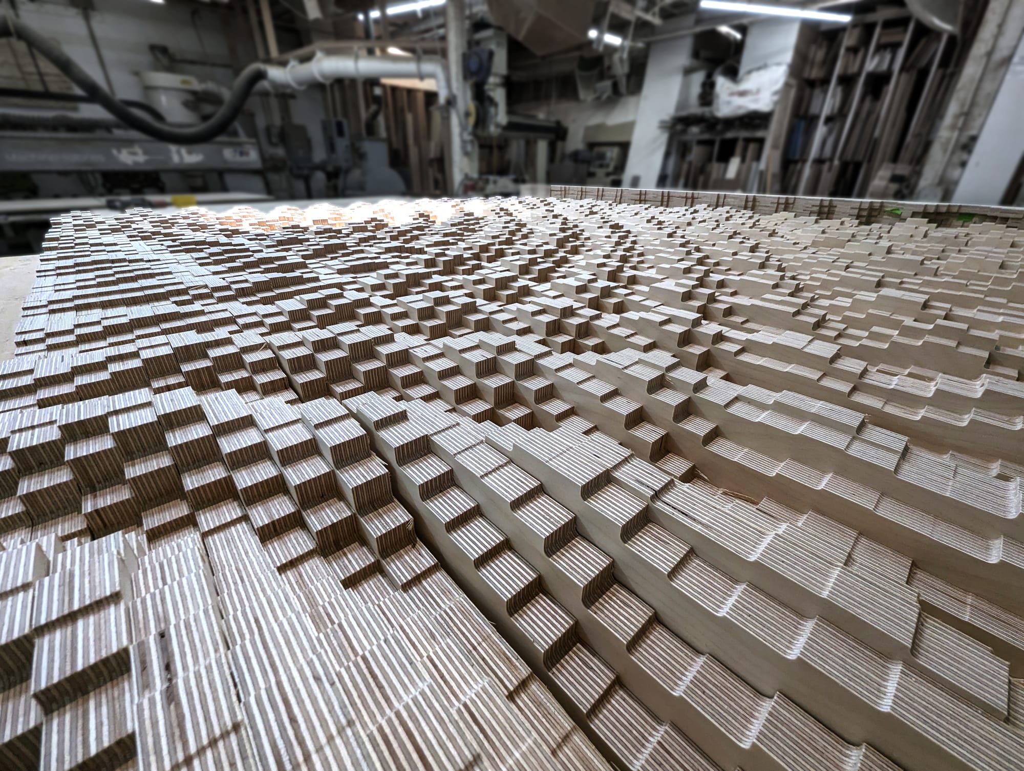 This inspired us to explore voxels, or volumetric pixels, to break down the smooth, rippled water surfaces we had designed. By "digitizing" the surface using a voxel technique, we created a lower-resolution, blocky version of the original design, which we then cut into plywood ribs and laminated together. .