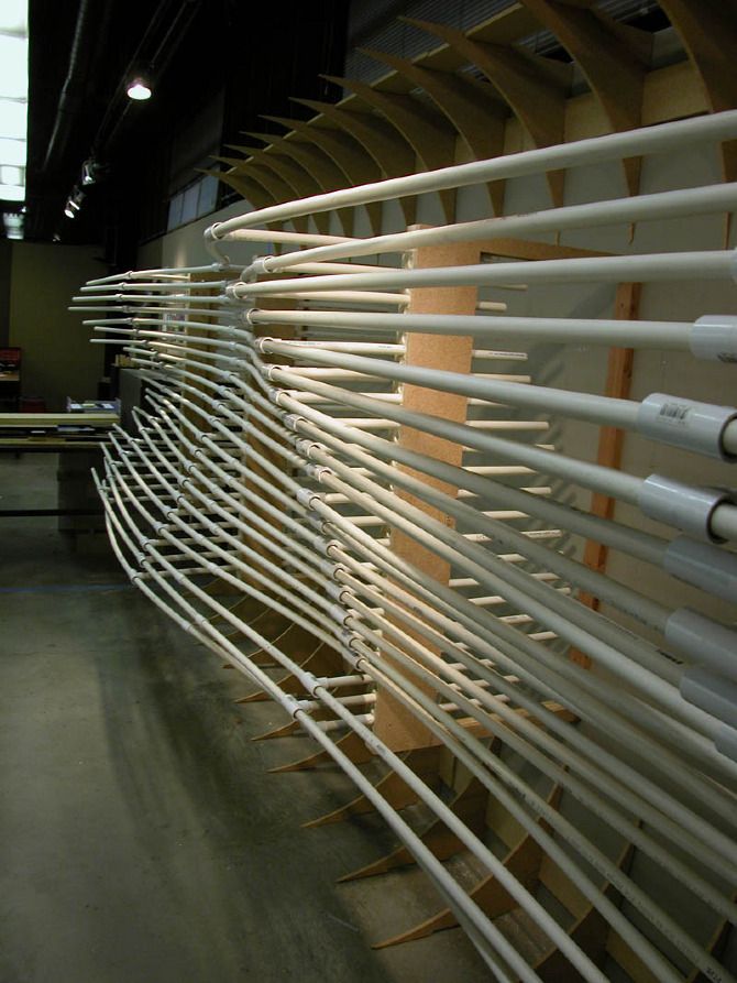 Analog recreation of a lofted surface by way of Home Depot. The articulating connection nodes take the place of the control points of a computer surface model